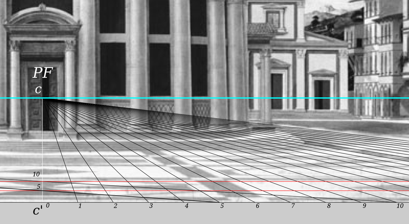 - Cada línea horizontal representa una medida de profundidad en la pintura a partir de la intersección entre PP y el plano del piso.