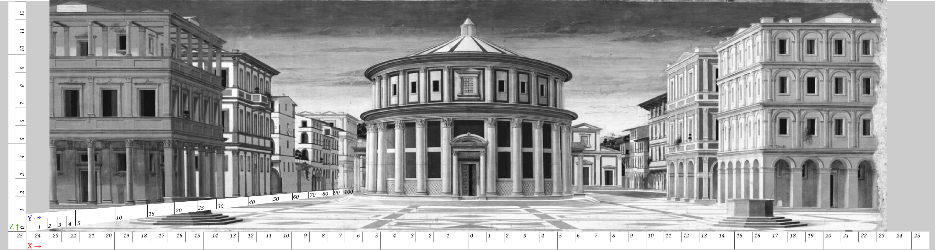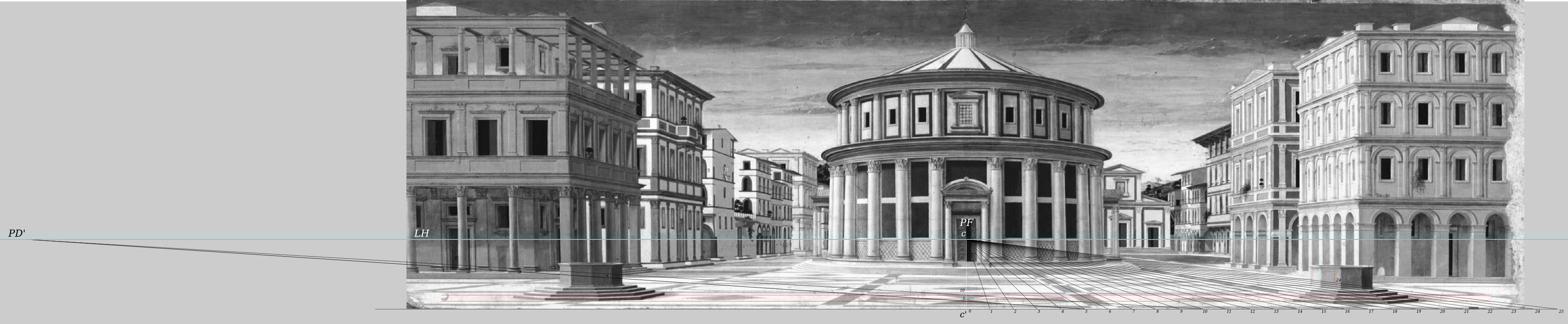A partir de la retícula elaborada sobre PP se contruyen tres reglas que sirvan como medida para medir las distancias entre los diferentes puntos de la pintura. Para elaborar la regla de la profundidad es necesario proyectar los puntos sobre el eje X de PP hacia PD o PD’, dado que PF se encuentra en la mitad horizontal de la pintura.